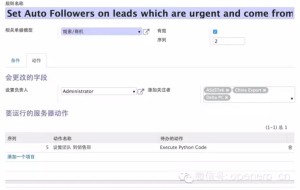 更改纪录上的字段,其中“设置负责人”就是修改线索上的销售员,从代码上看就是修改对象上的user_id字段。销售相关的对象这个字段一般就是销售人员。“添加关注者”,顾名思义就是添加关注者关注这个纪录,这里是可以多选的。这样设置的结果就是“所有来自美国的线索都会自动把销售人员设置为:Administrator而且添加上面三人为关注者”。